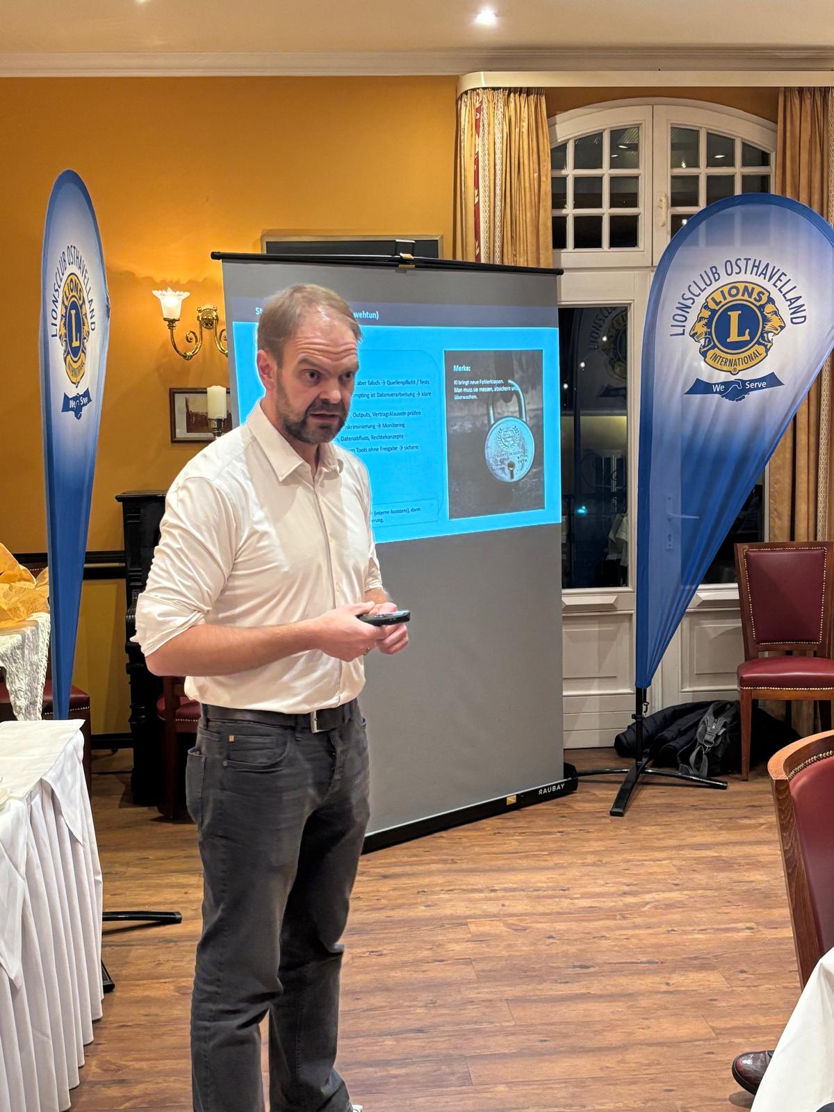 Vor dem Thema „KI“ trat jedoch Distrikt Governor Wolfram Zabel vor das Publikum und zeichnete das langjährige Lionsmitglied Arnim Rohwer mit der höchsten Ehrung aus, die Lions International zu vergeben hat. Rohwer, der aus beruflichen Gründen per Videoübertragung zugeschaltet war, erhielt der „Melvin Jones Fellow“ für seinen unermüdlichen Einsatz im Club, im internationalen Jugendaustausch und für das Eintreten die wohltätigen Zwecke der internationalen Lionsbewegung.